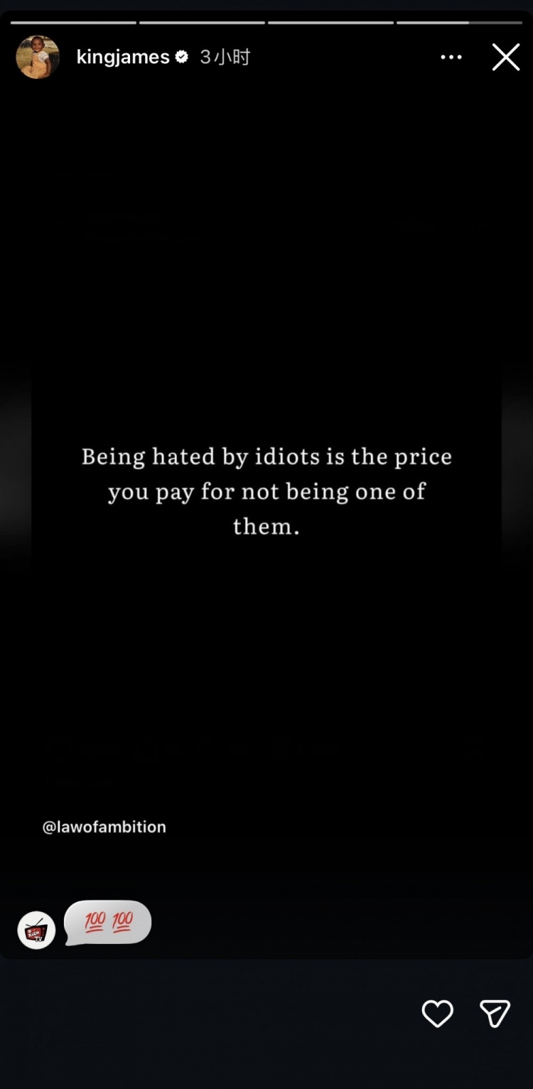詹姆斯转发了一则格言:“被愚蠢的人讨厌,是你不成为他们中一员的代价。”