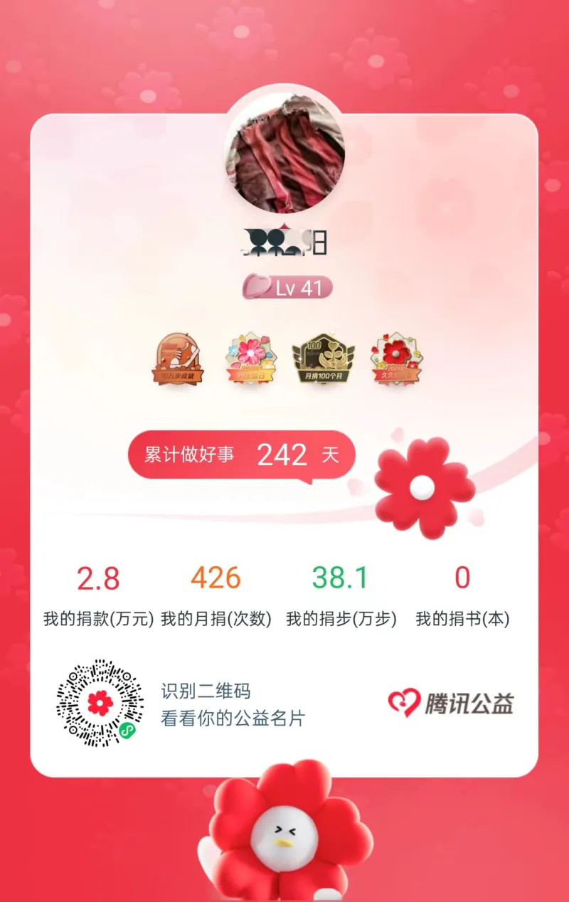我开始做公益捐款的初心源自于2015年底,媳妇怀孕了,就想着为孩子做一点善事,尽一些力回馈社会。于是我就抱着“旦行善事,莫问前程”心态,在相对可靠的平台做一些慈善。刚开始是在支付宝平台,也是零零星星的捐款,每逢节假日,二十五十的这样捐。到2016年的时候,开始固定在腾讯公益平台月捐。那个时候我还在学校读书,没什么收入,一开始月捐的金额很少,一个月40块钱。2016年6月上班,工资一个月3000多,10年来随着收入增长,把每个月捐款额度从40块钱,逐渐增加到60块、120块、200块、300块这样。目前我在事业单位做行政后勤工作,收入刚刚接近几年前的街薪这样,近几年因为有个项目募捐期满了,我也没有花精力寻找新的项目,所以每个月用作公益捐赠的钱就是225块钱,平时我也不点开看,确实也疏于打理,每个月就放在那里自动扣款。
