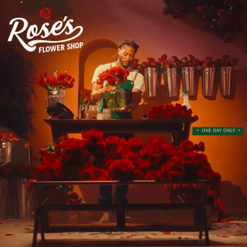 在芝加哥皮尔森社区的一处名为Inside the Vault Gallerie的建筑里——这里原本是一个车库,如今被改造成快闪店——德里克-罗斯把一条绿色帆布围裙系在身上,颜色像花茎一样。围裙领口下方、他的个人标志旁,刻着一行字:“Rose’s Flower Shop(罗斯花店)”。