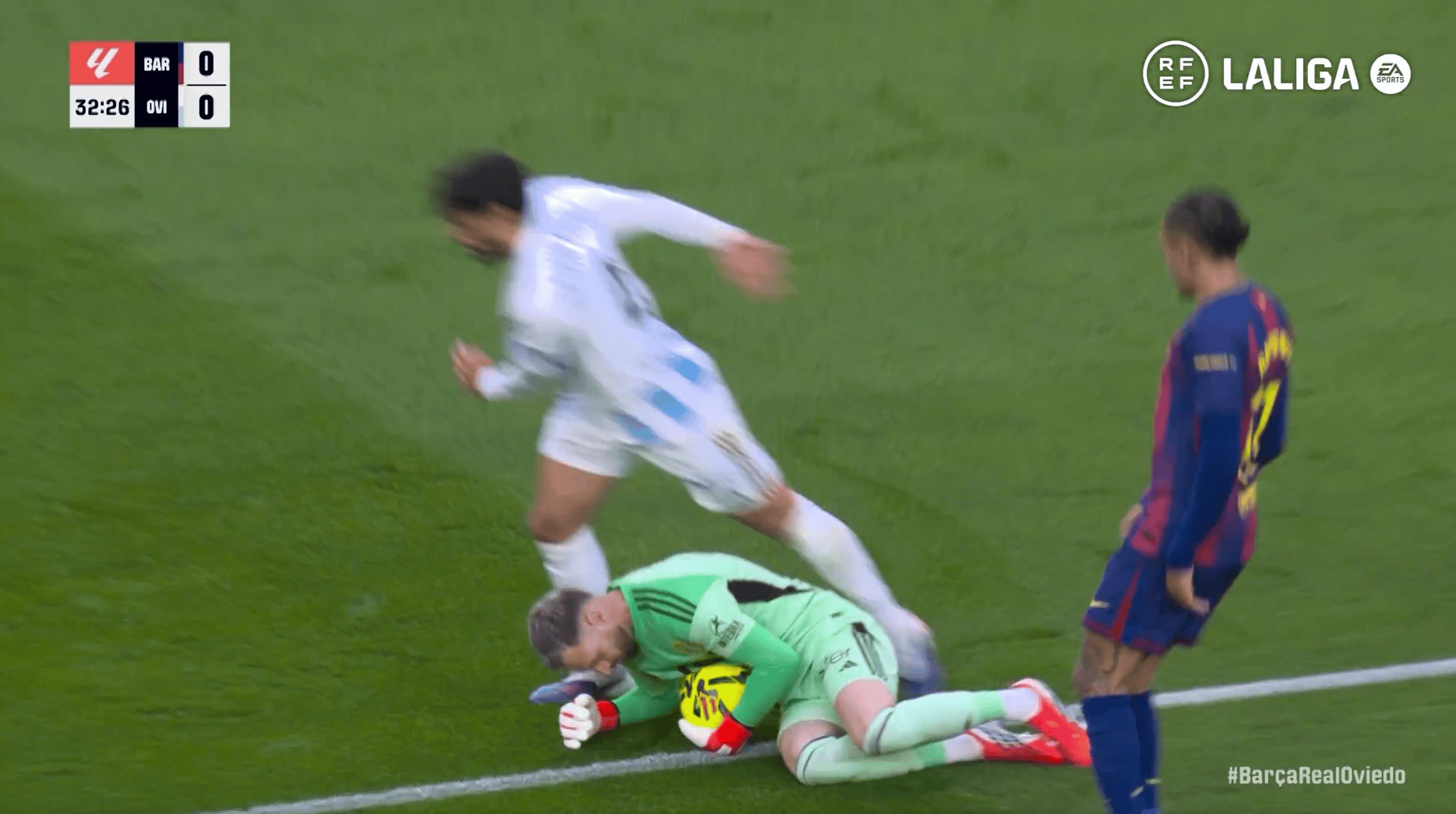 第一起争议出现在奥维耶多门将阿隆-埃斯坎德利在禁区内接球的场景。当值主裁胡安-马丁内斯-穆努埃拉当时判给巴萨一次禁区前任意球,认为门将带球出了禁区。不过CTA在复盘中指出,从慢镜头来看,埃斯坎德利对皮球的控制发生在禁区线以内,因此并不存在犯规,任意球判罚属于误判。至于门将随后吃到的黄牌,CTA解释称,那张黄牌是因其抗议判罚而出示。CTA同时表示,这一情形不符合VAR介入的四种条件,因此视频裁判无法介入纠正。