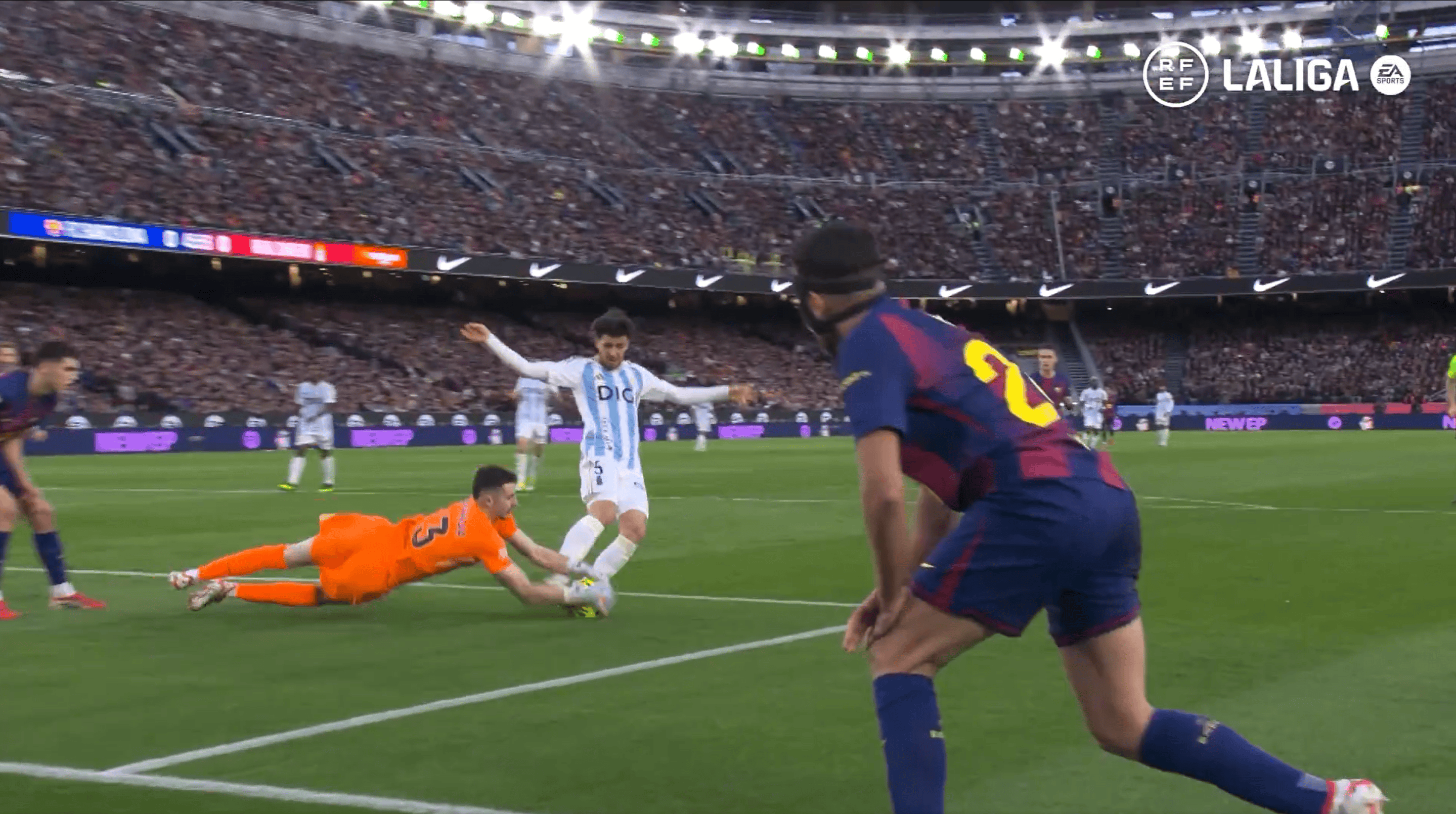 第二起争议发生在上半场临近结束时。巴萨门将乔安-加西亚在禁区内出击处理一记五五开的来球,过程中奥维耶多球员阿尔贝托-雷纳倒地,引发是否应判点球的讨论。CTA明确给出结论,认为巴萨门将并未犯规:“门将先于对方球员控制住皮球,因此在任何情况下都不存在点球的判罚空间。”