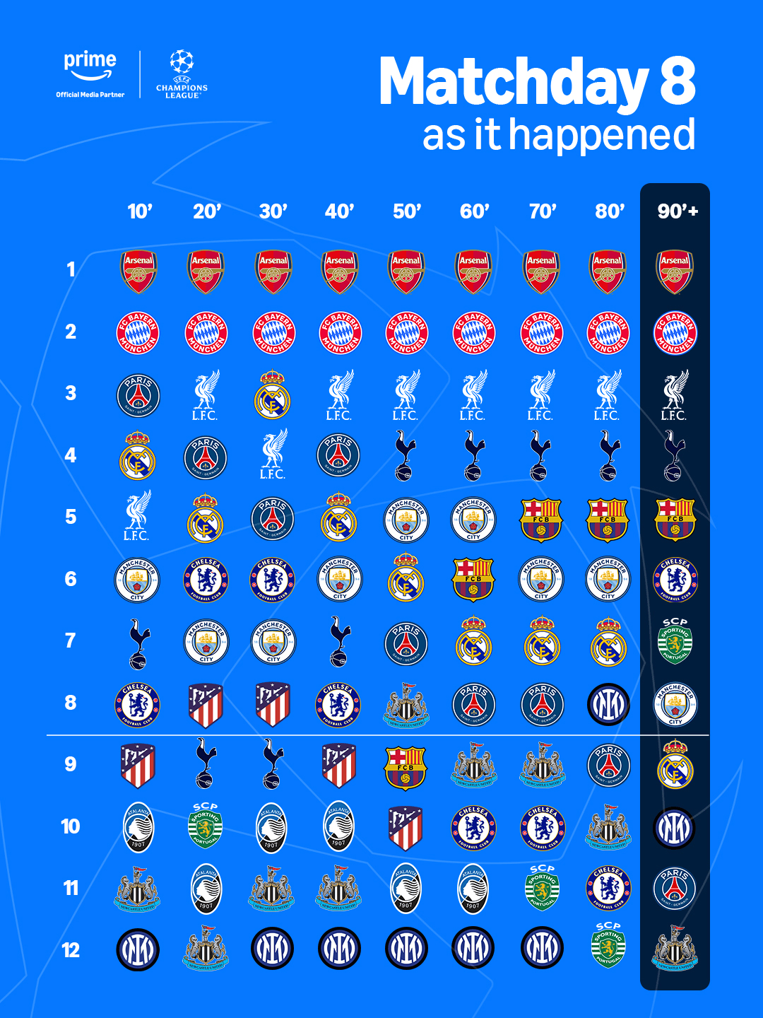 上述这张动态进程图,还原了各队在最后一轮中,每10分钟的实时积分形势变化,让我们重温了那惊心动魄的90分钟。