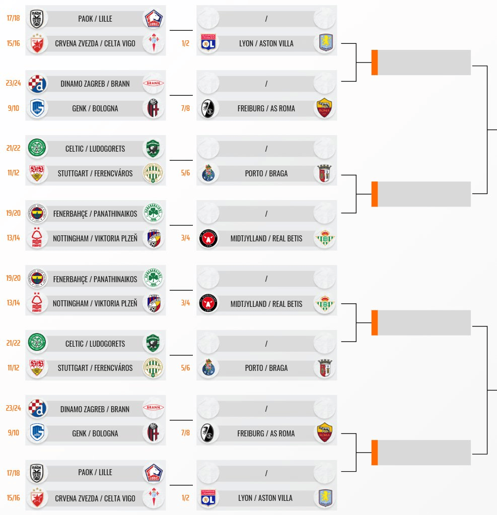 皇家贝蒂斯vs诺丁汉森林、阿斯顿维拉vs塞尔塔、阿斯顿维拉vs里尔、里昂vs里尔、里昂vs塞尔塔、波尔图vs斯图加特、罗马vs博洛尼亚、弗赖堡vs博洛尼亚、皇家贝蒂斯vs费内巴切