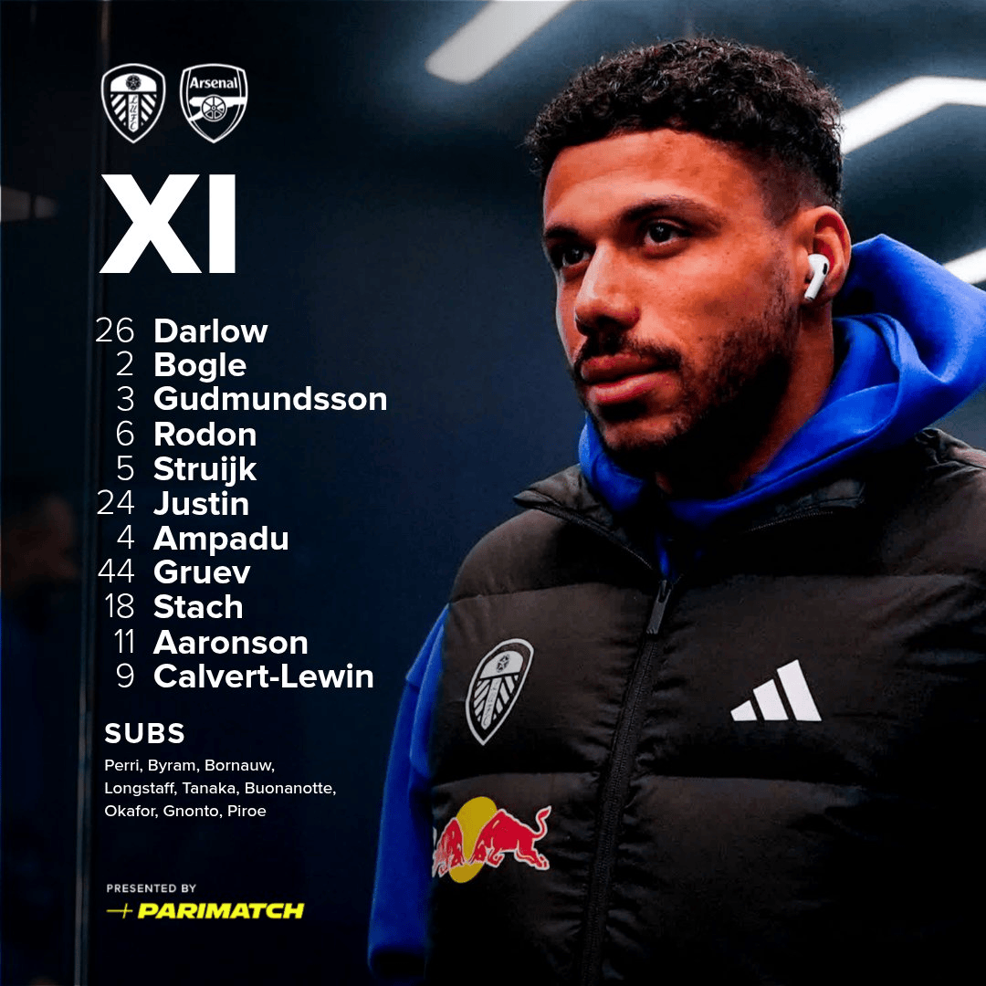 利兹联首发:26-达尔洛、2-杰登-博格、3-古德蒙德森、24-贾斯汀、4-阿姆帕杜、5-斯特鲁伊克、6-罗登、11-阿隆森、18-斯塔赫、44-古尔夫、9-勒温