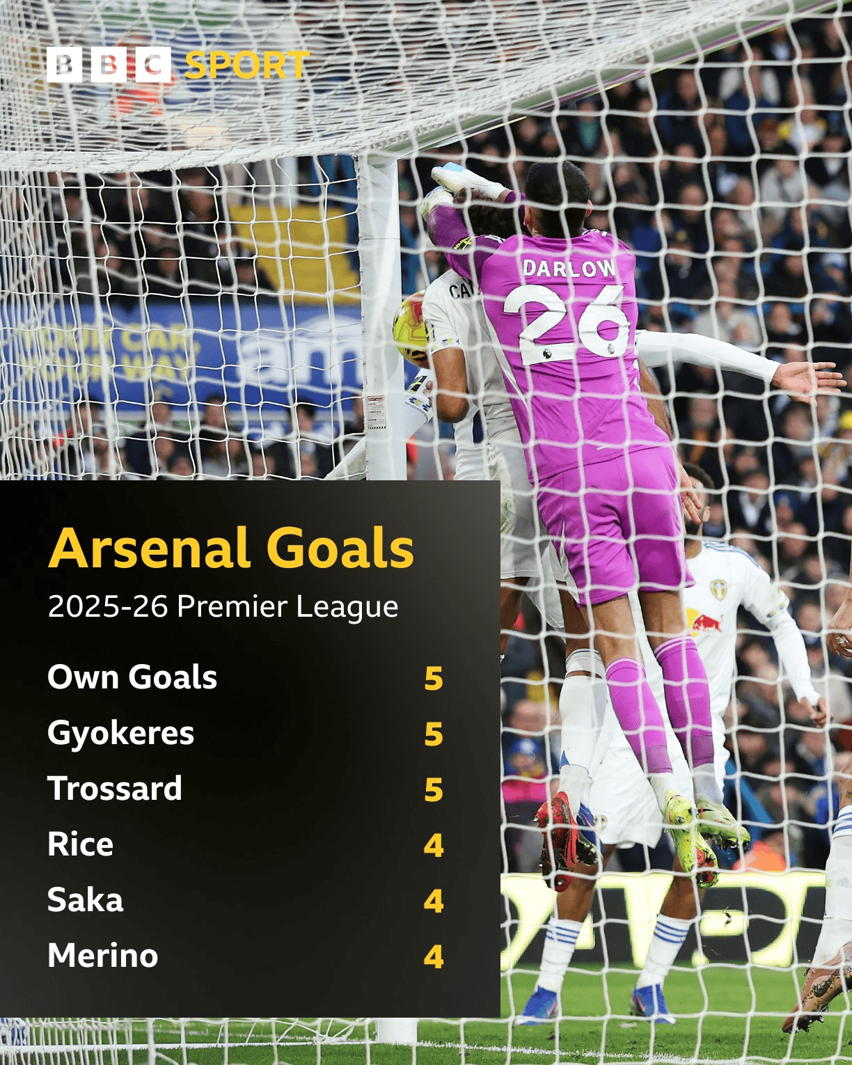乌龙球也追平哲凯赖什和特罗萨德,成为本赛季英超为阿森纳破门次数最多的“球员”。