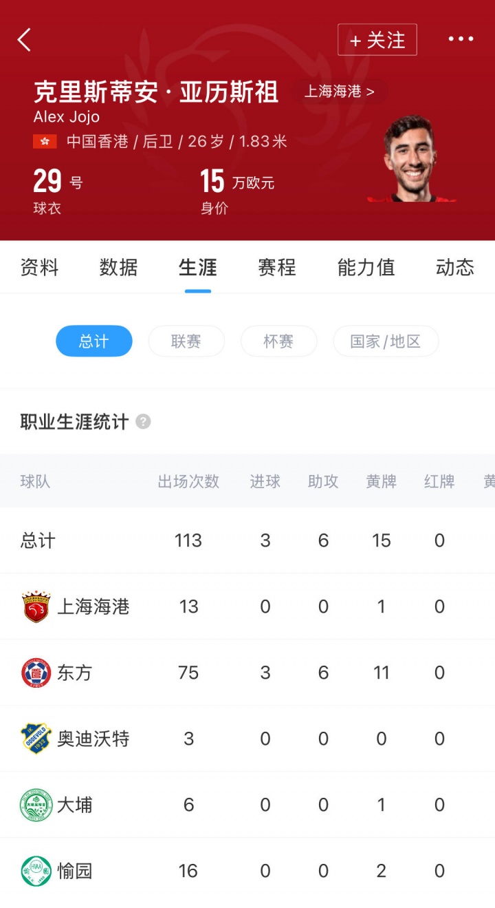 亚历斯祖现年26岁,这名中国香港后卫去年7月加盟上海海港,为海港出战了亚冠精英联赛以及下半程的中超联赛,各项赛事一共出场13次,跟随海港夺得2025年中超冠军。
